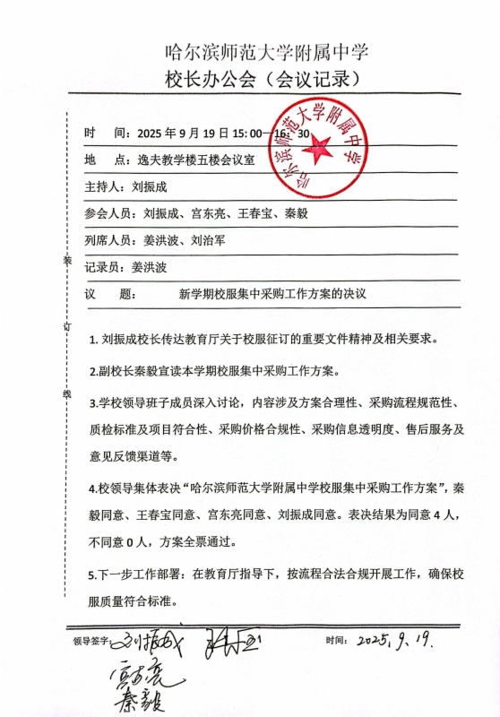 学校已将校服选用纳入“三重一大”事项,经校领导班子集体审议,通过了校服集中采购工作方案,并形成会议纪要。
