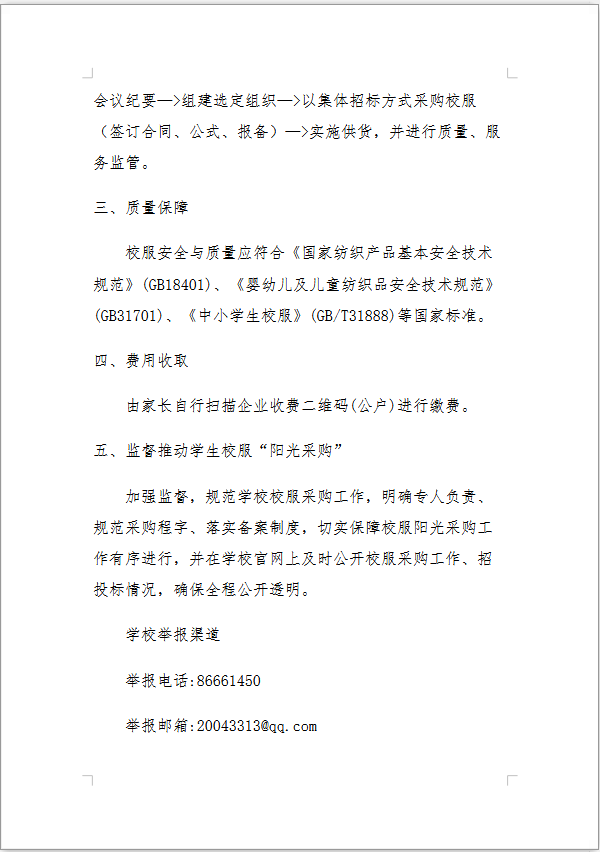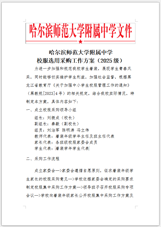 现将校服集中采购工作方案及相关会议纪要向高一年级家长予以公开。